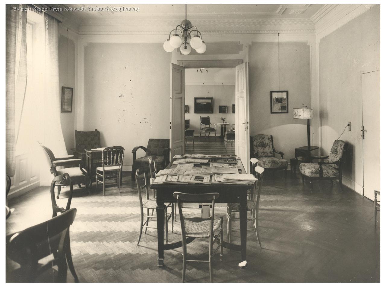 belső felvétel, olvasóterem, asztal, bútor, fotel, lámpa, hírlap