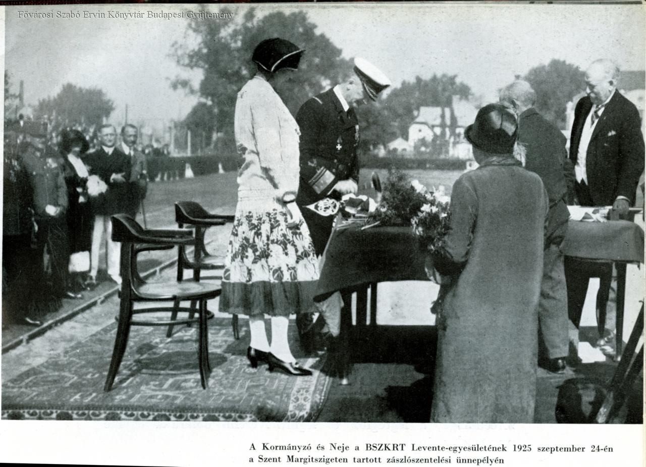 A kormányzó és neje a BSZKRT Levente-egyesületének 1925. szeptember 24-én rendezett a Szent Margitszigeten tartott zászlószentelési ünnepélyén