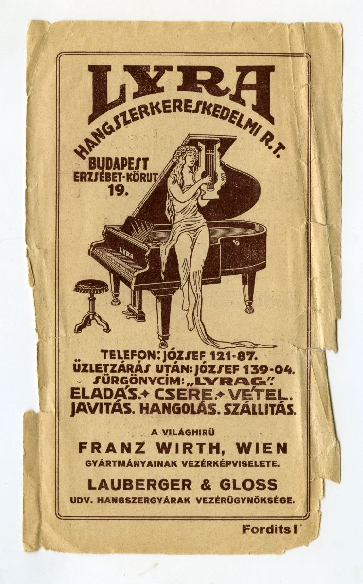 Lyra hangszerkereskedelmi Rt. Budapest. Erzsébet körút 19. Telefon: József 121-8 7
