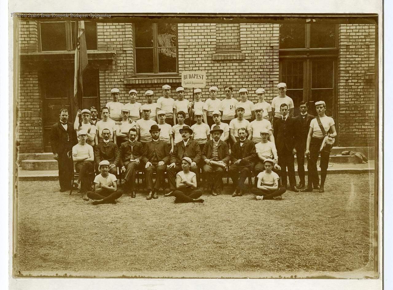 sport, sportcsapat, sportruházat, gimnázium, pedagógus, középiskolás, tanuló, udvar, csoportkép, 1900