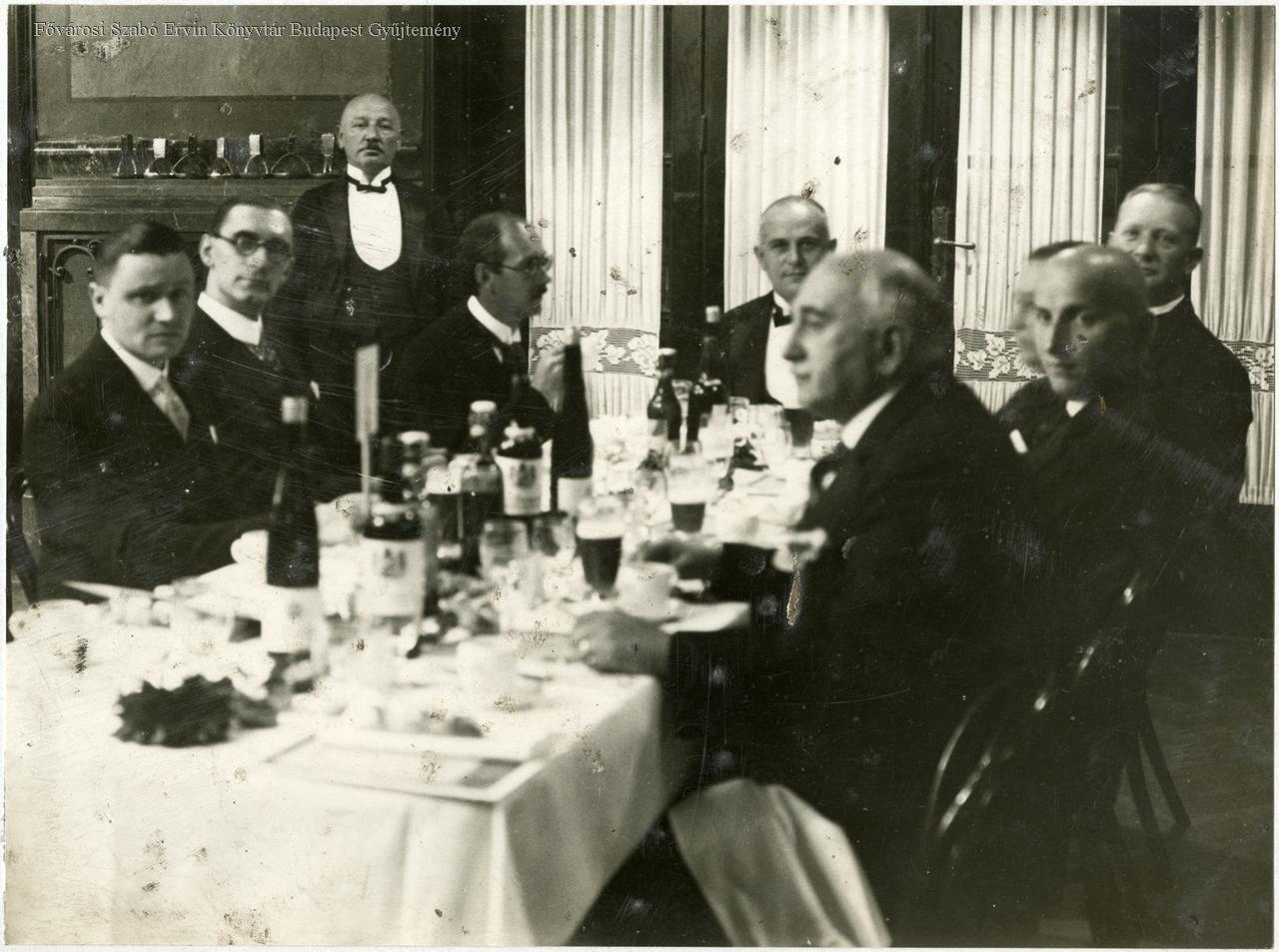 Szemben balról a második Péczely (Pacher) Béla, mellette Mátéka Béla, az asztal közelebbi oldalán jobbról az első Zilahy Dezső, második Markos Béla, a főváros idegenforgalmi hivatalának vezető szakemberei