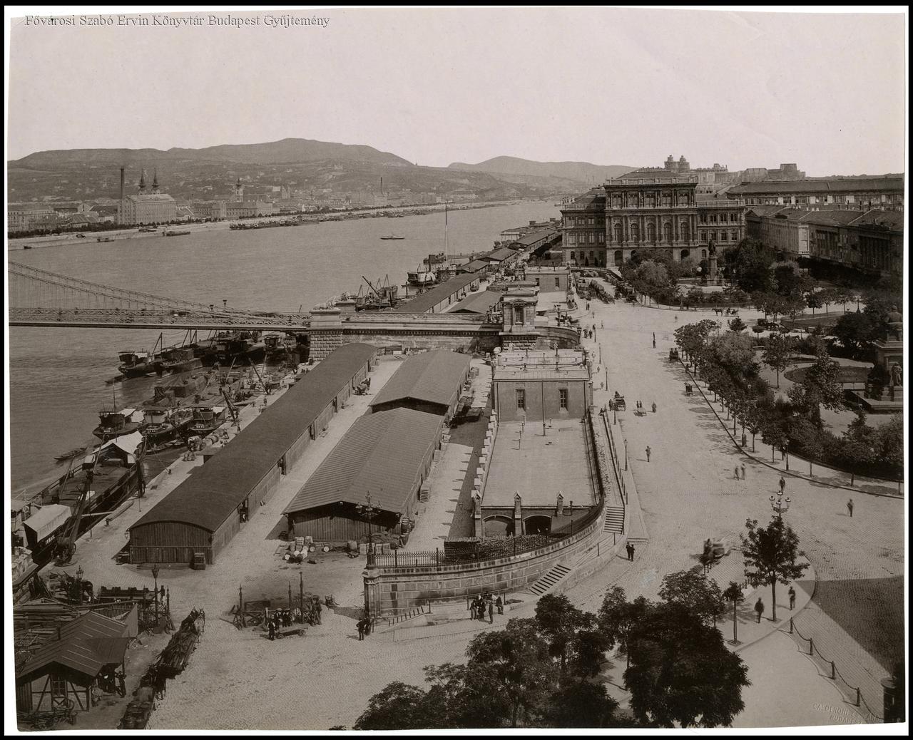 A Dunagőzhajózási Társaság raktárai, a hajók és a Roosevelt tér részlete felülről, a Stein-házból fényképezve