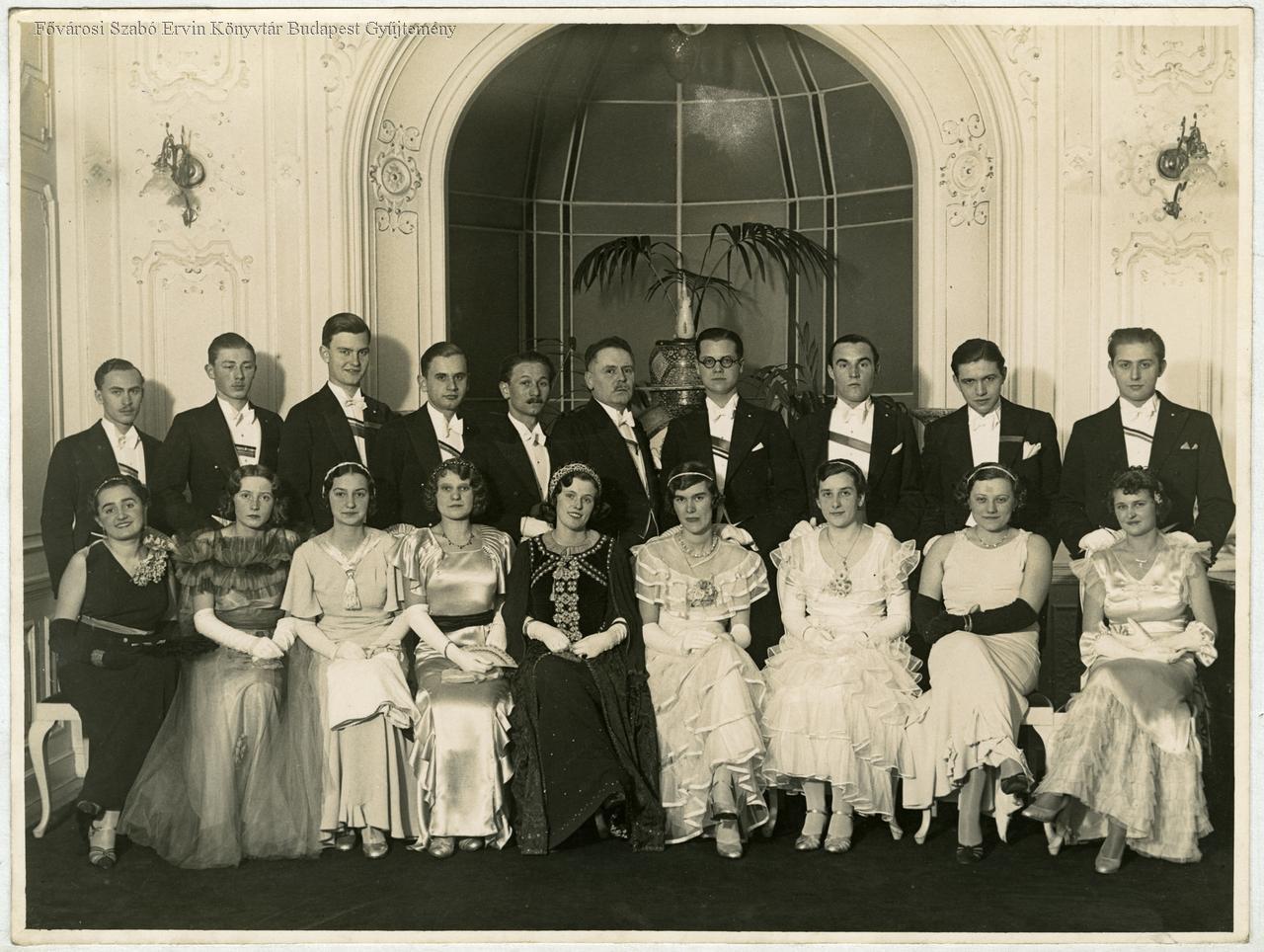 bál, középosztály, diákegyesület, egyetemi hallgató, estélyi ruha, farsang, csoportkép, 1935