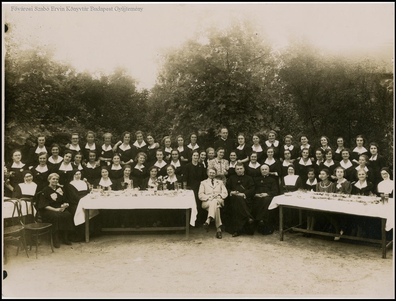egyházi iskola, pedagógusképzés, kert, ballagás, bankett, egyenruha, katolikus pap, apáca (szerzetes), egyházi ruházat, pedagógus, nő, nőképzés, vezető alkalmazott, 1937