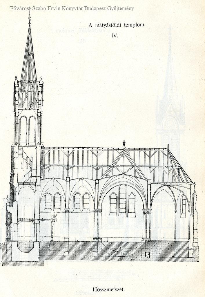 A Mátyásföldi templom, hosszmetszet, keresztmetszetek, oldalnézet, alaprajzok