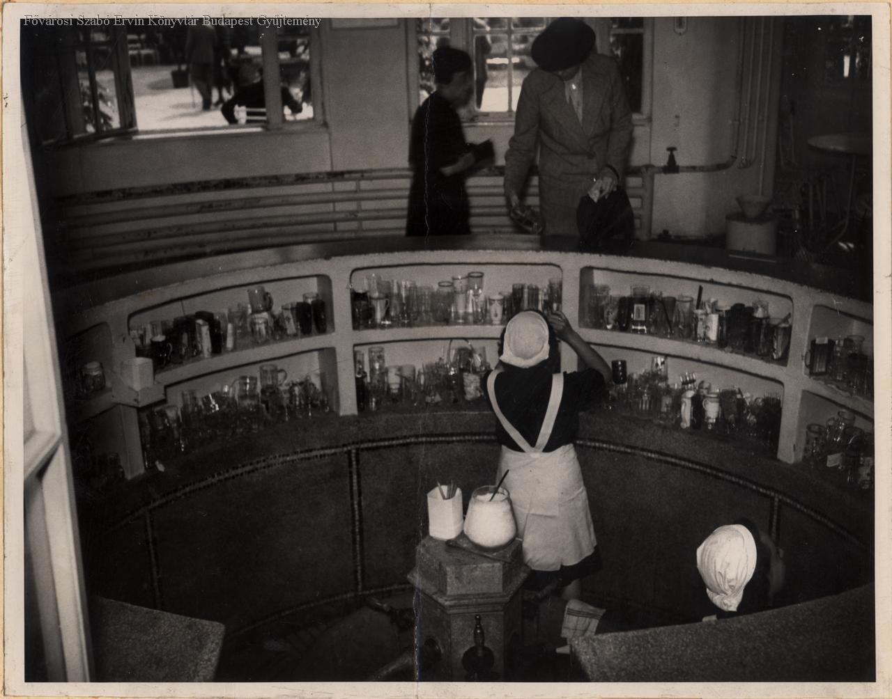 Ivócsarnok belseje. Fürdő-alkalmazottak és ügyfelek a kiszolgáló pult körül