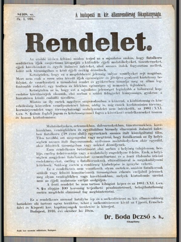 A Budapesti M. Kir. Államrendőrség Főkapitányságának rendelete a fiatalkorúak alkoholfogyasztásának és éjjeli mulatóhelyeken való dőzsölésének tilalmáról (Budapest környékén), melyet Dr. Boda Dezső főkapitány hozott meg. A rendelet 1916. október 19-én lépett hatályba.