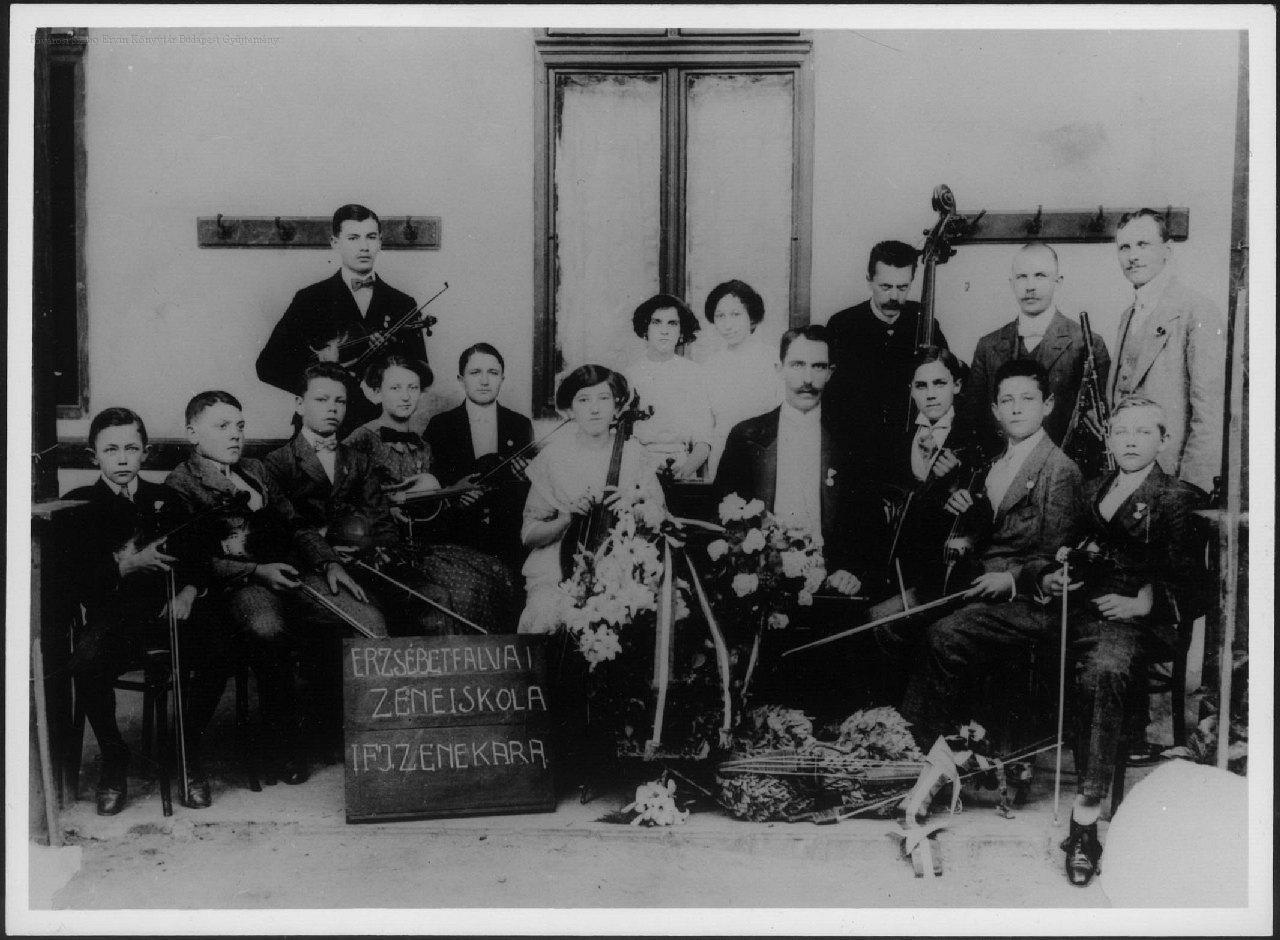 zeneoktatás, komolyzenei előadó, tanuló, pedagógus, hangszer, embléma, csoportkép, 1910-es évek