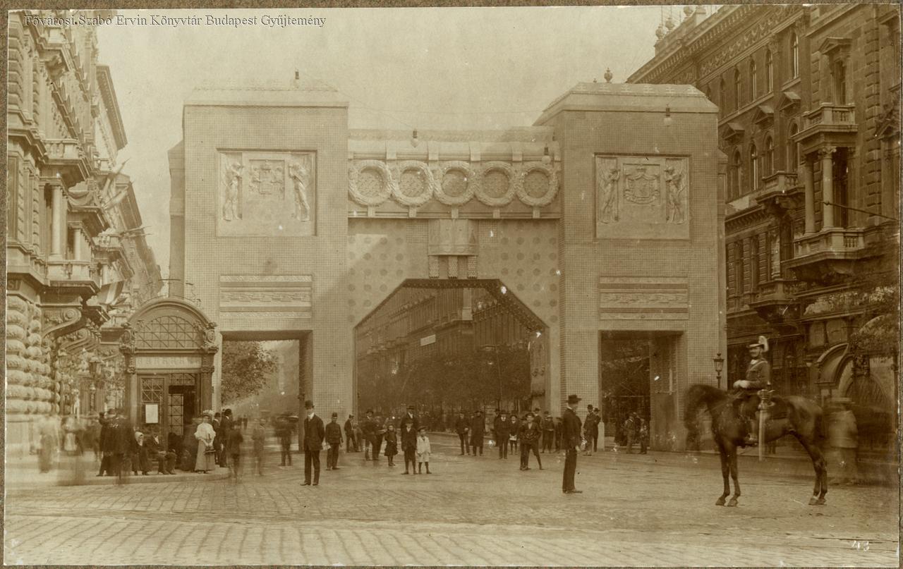 [Andrássy út a Alfonz spanyol király tiszteletére emelt diadal kapuval 1908-ban]