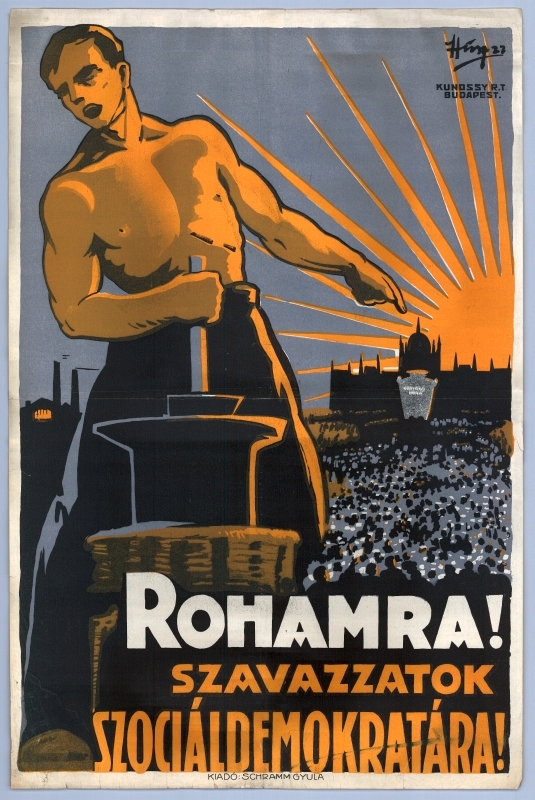 színes, litografált plakát, Szociáldemokrata Párt, politika, propaganda plakát, választás, munkás, kalapács, 1922