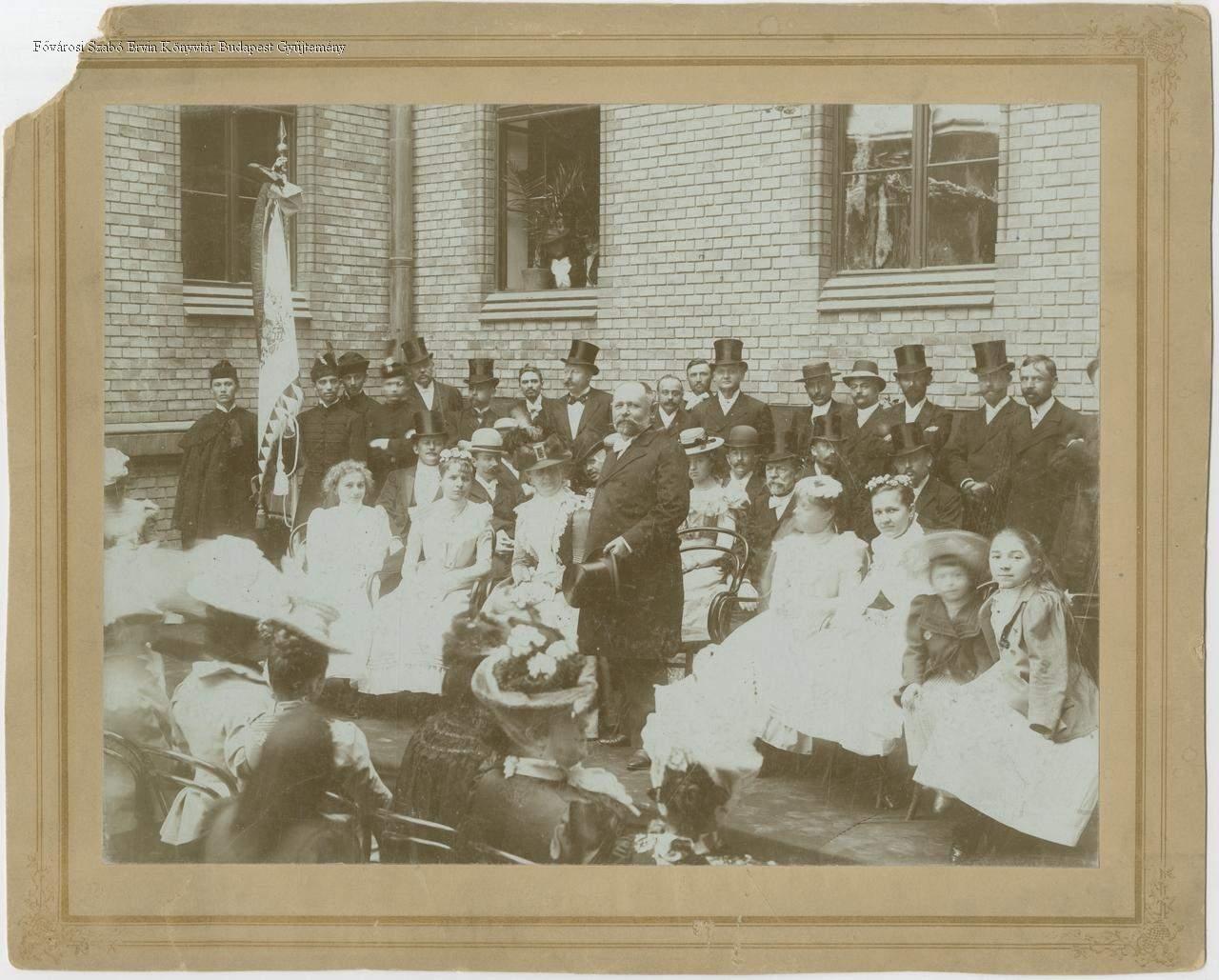 [Ullerich Gyula iskolaigazgató tanári működésének harmincéves évfordulójára rendezett ünnepség a VIII. Német utcai székesfővárosi polgári iskola udvarán, 1900. június 24-én]