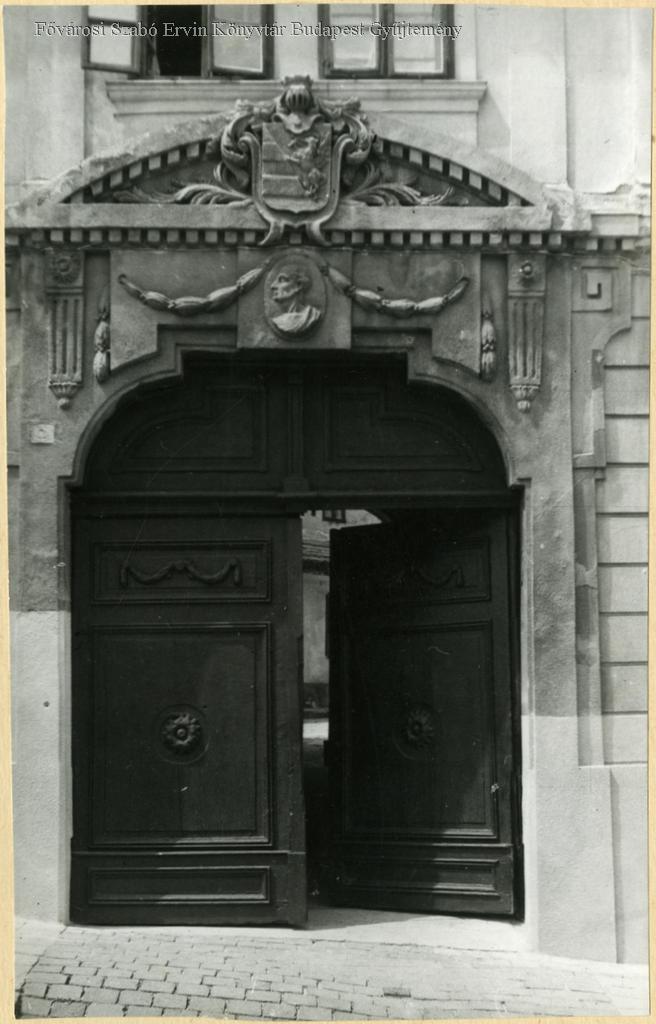[A Donáti utca 14. számú ház bejárata, kapu felett címer, férfiportré, kőfaragás]