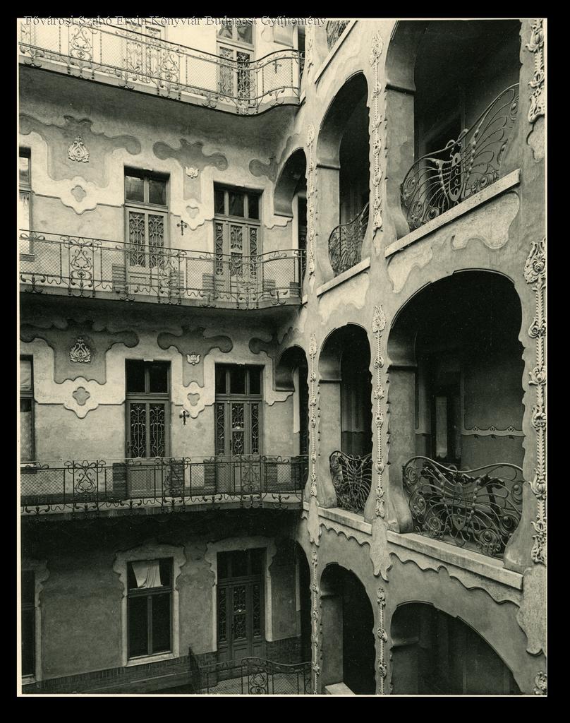 bérház, lakóépület, udvar, szecesszió, függőfolyosó, korlát, vasművesség, díszítés, épületkép, külső felvétel, 1907-1910 között