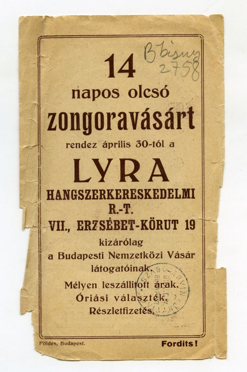 üzlet, zongora, Budapesti Nemzetközi Vásár, reklámnyomtatvány, kisnyomtatvány, aprónyomtatvány, számolócédula