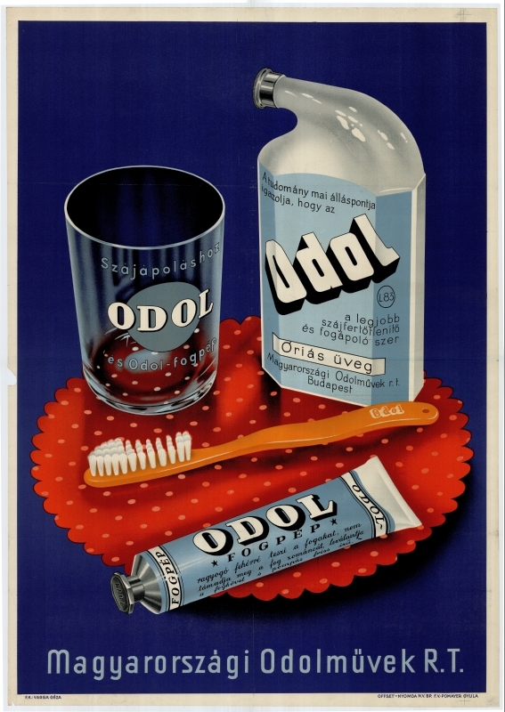 A magyarországi Odolművek R.t. szájápolási termékeinek (szájfertőtlenítő és fogápoló oldat, fogkefe, fogpép) hirdetési plakátja. A képen az Odolművek termékei láthatók.