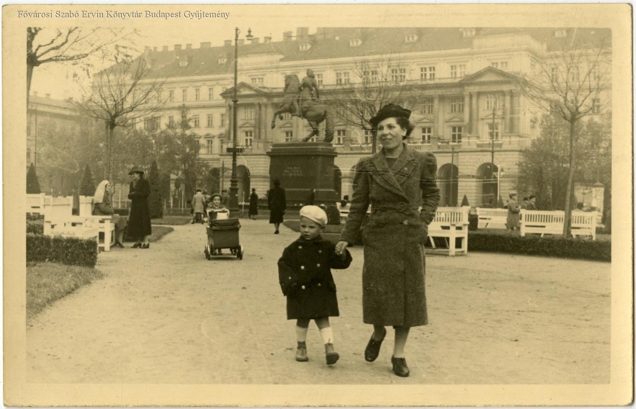 [Anya kisfiával a Rákóczi-szobor előtt sétál a Kossuth téren]