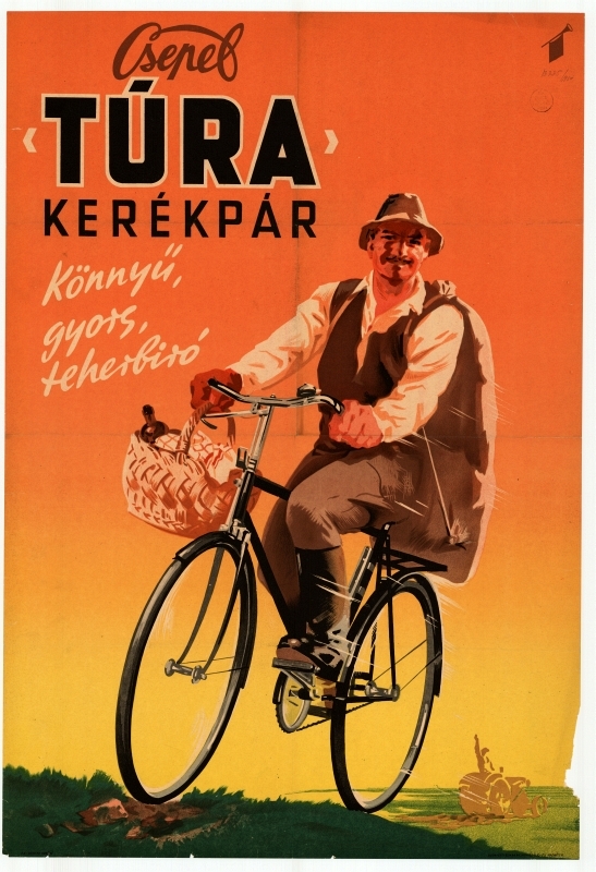 Csepel túrakerékpár reklámplakátja. A reklámplakát ábrázolása szerint a bicikli nem csak túrázáshoz, hanem például bevásárláshoz (városi közlekedésre) is alkalmas.