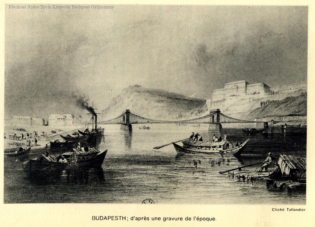 Litográfia a Várpalota és a Gellérthegy látképével. 1830-as évek. Elöl a Lánchíd, a pesti oldalon a Lloyd-palota. Északi nézet