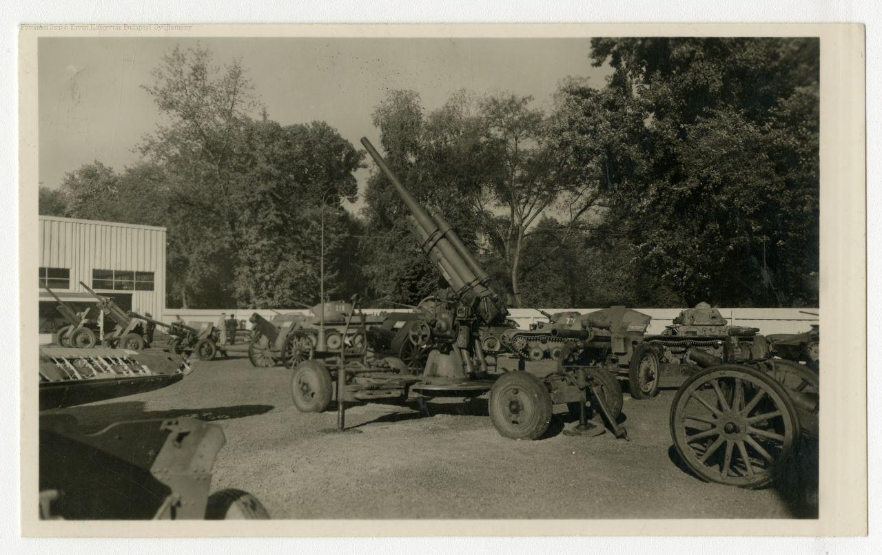 múzeum, második világháború, hadiipar, kiállítás, ágyú, páncélozott harci jármű, külső felvétel, képes levelezőlap, 1940-es évek