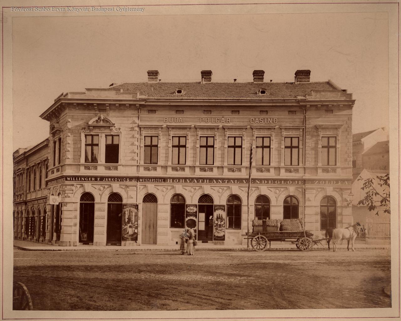 klub, étterem, cégtábla, mészáros, lovas kocsi, épületkép, külső felvétel, 1880-as évek