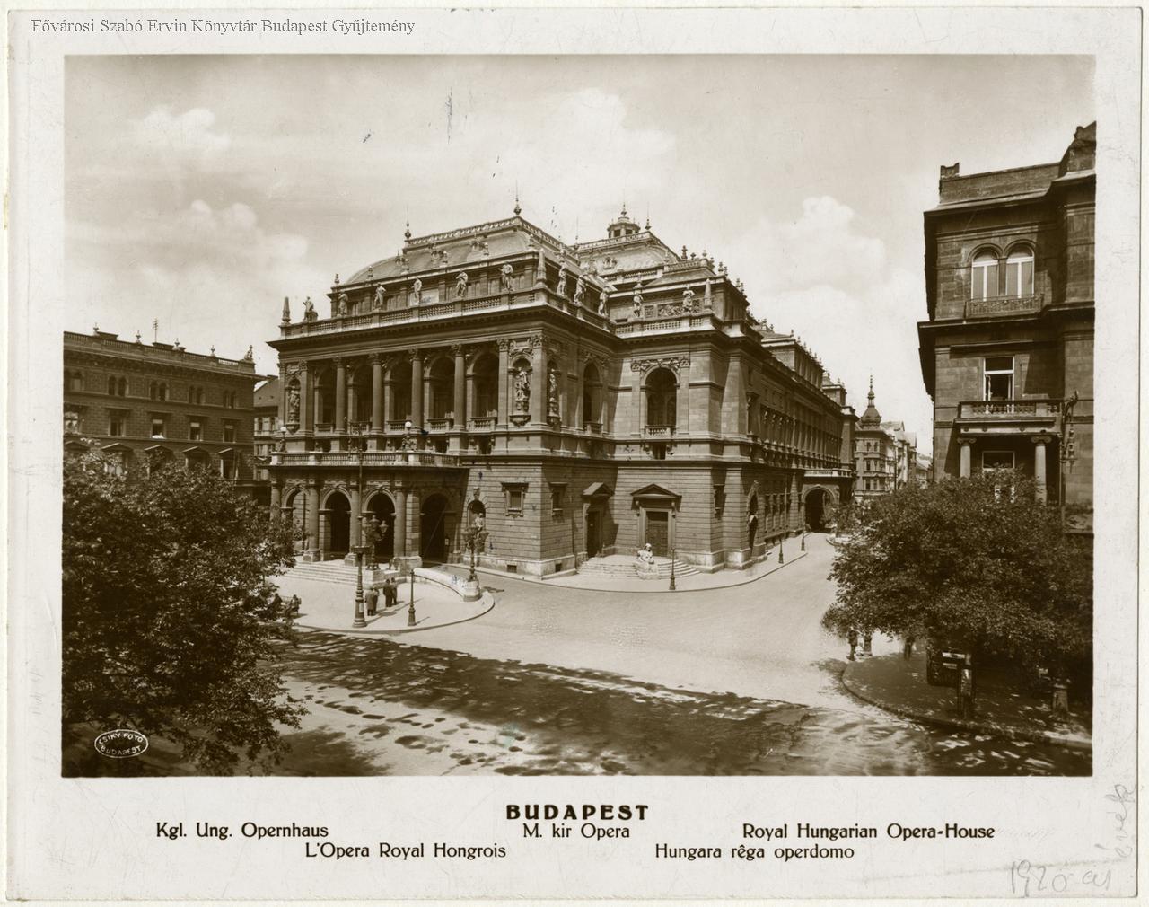 épületfotó, operaház, homlokzat, épületdíszítés, szobor, lámpa, utcakép, közút, 1920-es évek