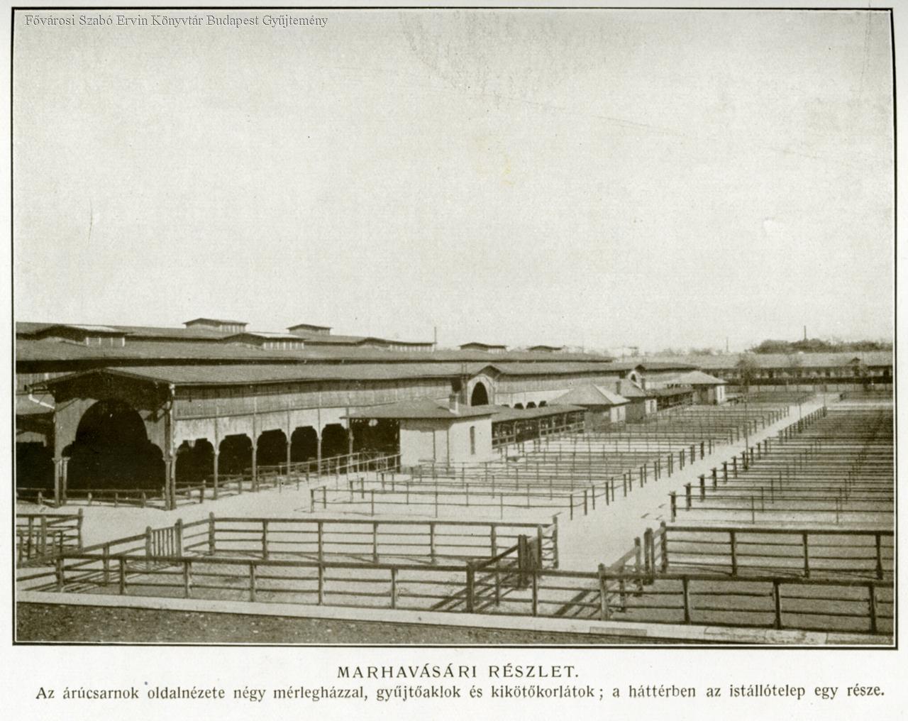 Az árucsarnok oldalnézete négy mérlegházzal, gyűjtőaklok és kikötőkorlátok, a háttérben az istállótelep egy része