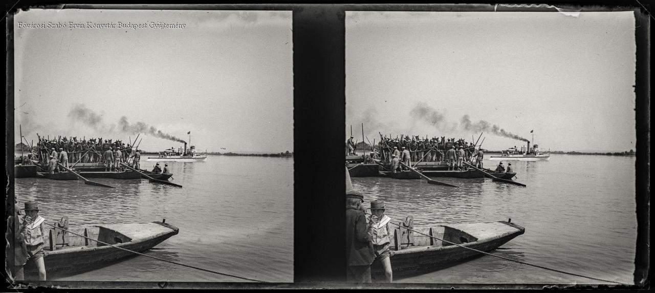 katona, hadászat, hadgyakorlat, egyenruha, hajó, csónak, vízi közlekedés, ló, férfi, életkép