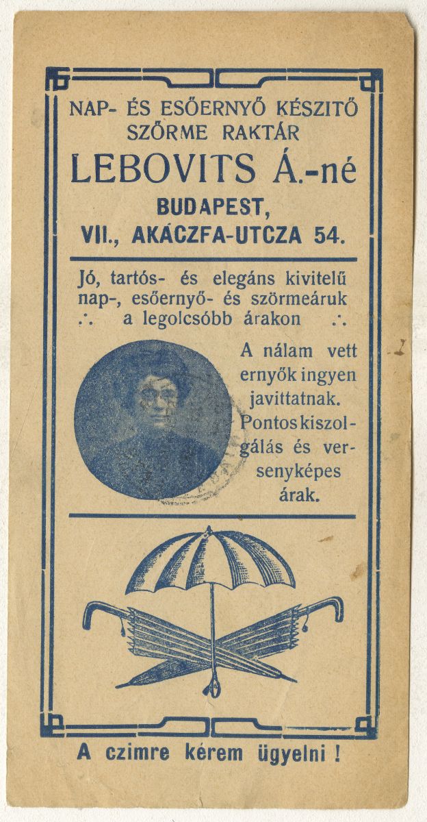 Nap- és esernyő készítő szőrme raktár Lebovits Á-né. Budapest, VII., Akácfa utca 54.