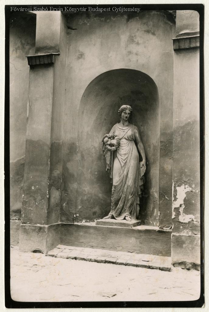 Udvari falfülkében álló női alak. A házat lebontották. A szobor az Arany János u. 15. sz. házba került