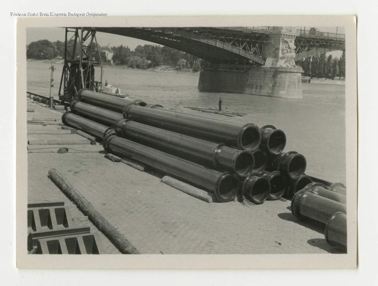 Az átépítéshez használandó csövek a rakparton. Háttérben a budai szárny részlete, a híd alatt elhaladó hajó és a Margitsziget