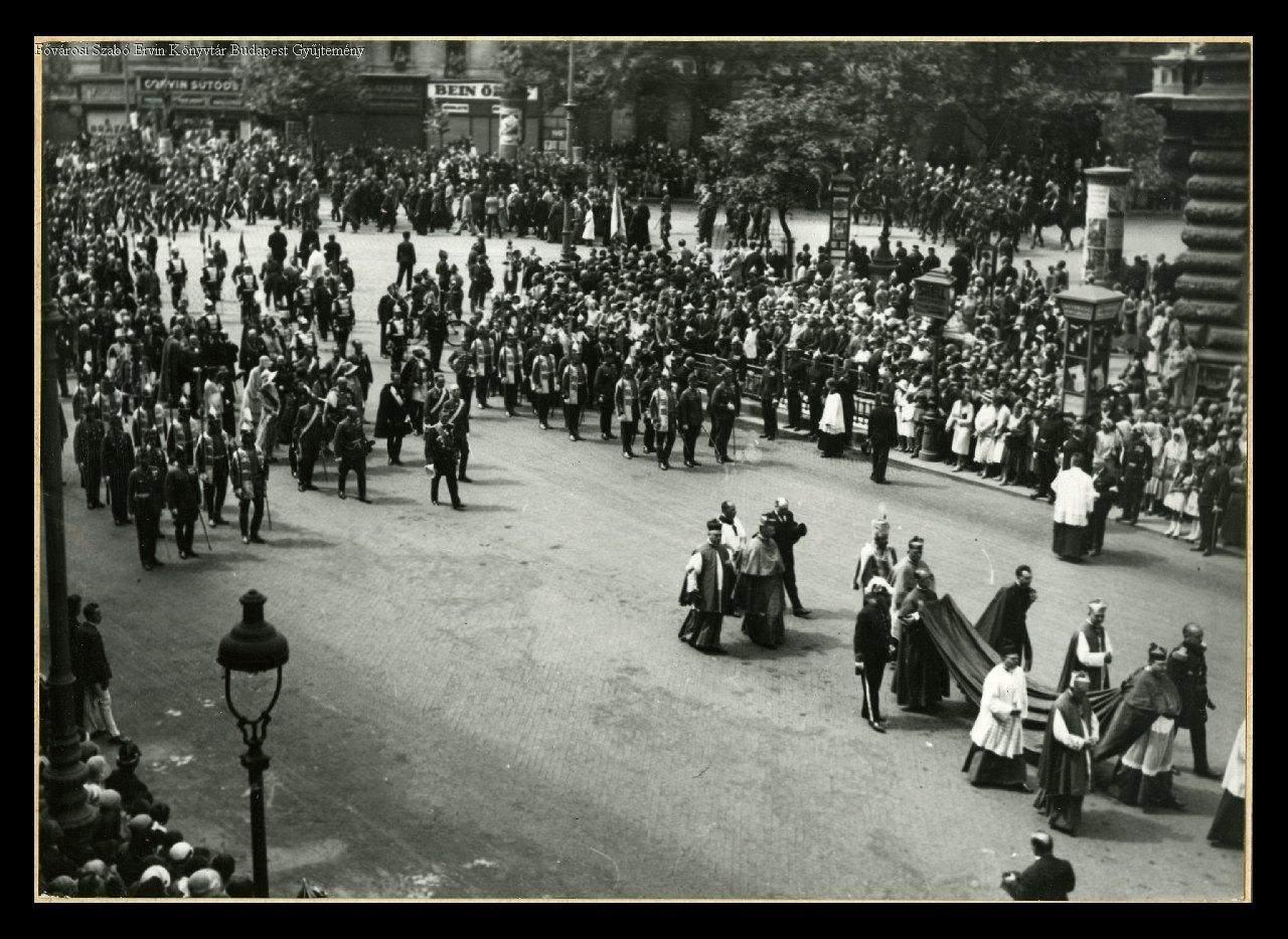 körmenet, főpap, katolikus pap, államfő, kormány, nézők, történeti évforduló, Szent Imre-év, katolikus egyház, egyházi ünnep, testőrség, Horthy-korszak, 1930