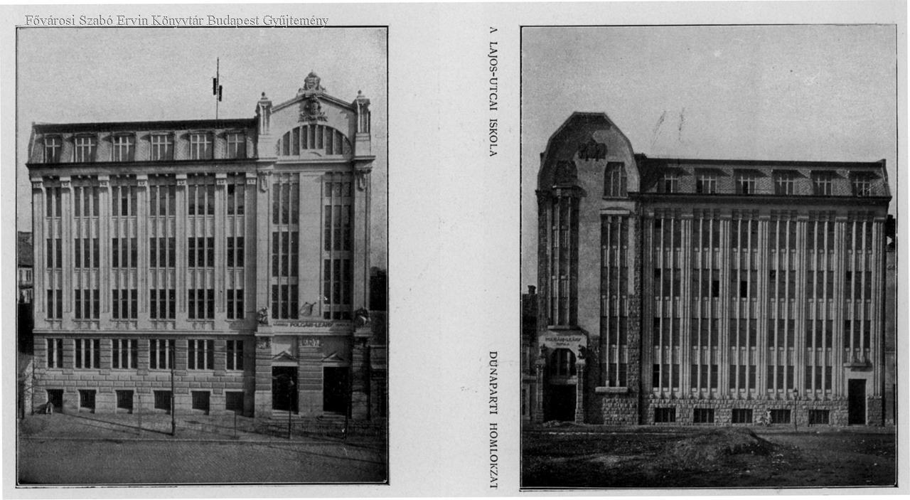 A Lajos-utcai iskola : Dunaparti homlokzat, Lajos-utcai homlokzat Novák Imre, Góth Jenő /