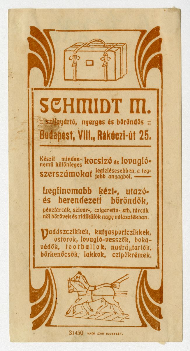 bőripar, bőrdíszműves, szíj, bőrönd, lószerszám, pénztárca, tárca, ridikül, nyakörv, ostor, kenőcs, lakk, cipőkrém, reklámnyomtatvány, kisnyomtatvány, aprónyomtatvány, számolócédula