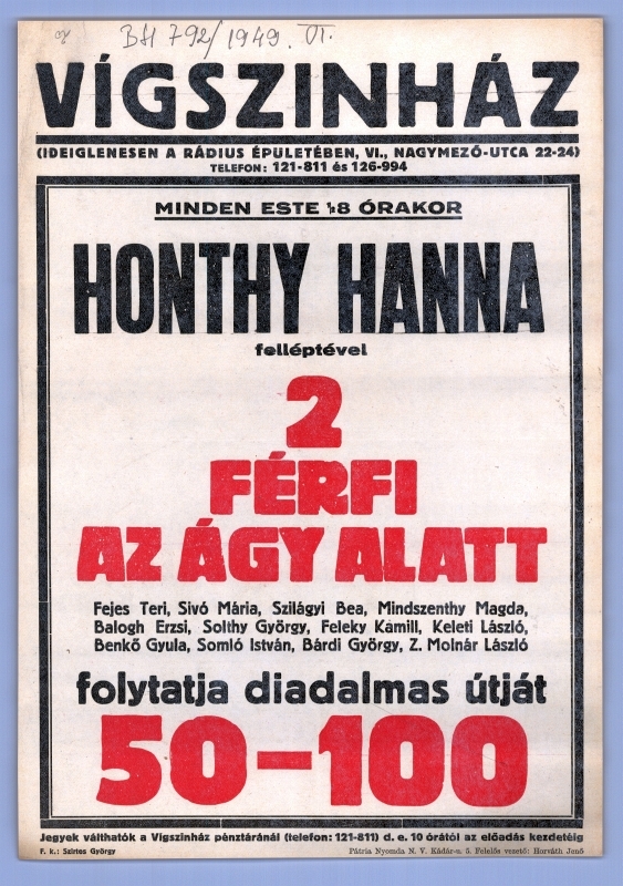 Vígszínház "Két férfi az ágy alatt" című 3 felvonásos, napi rendszerességgel játszott vígjátékának plakátja, 1949, tájékoztat a darab sikerességéről (50-100 előadás), főszerepben: Honthy Hanna, Fejes Teri, Sivó Mária, Szilágyi Bea, Mindszenthy Magda, Balogh Erzsi, Solthy György, Feleky Kamill, Keleti László, Benkő Gyula, Somló István, Bárdi György, Z. Molnár László, rendező:Benkő Gyula, díszlet: Neogrády Miklós, jelmez: Szenthe Istvánné.
