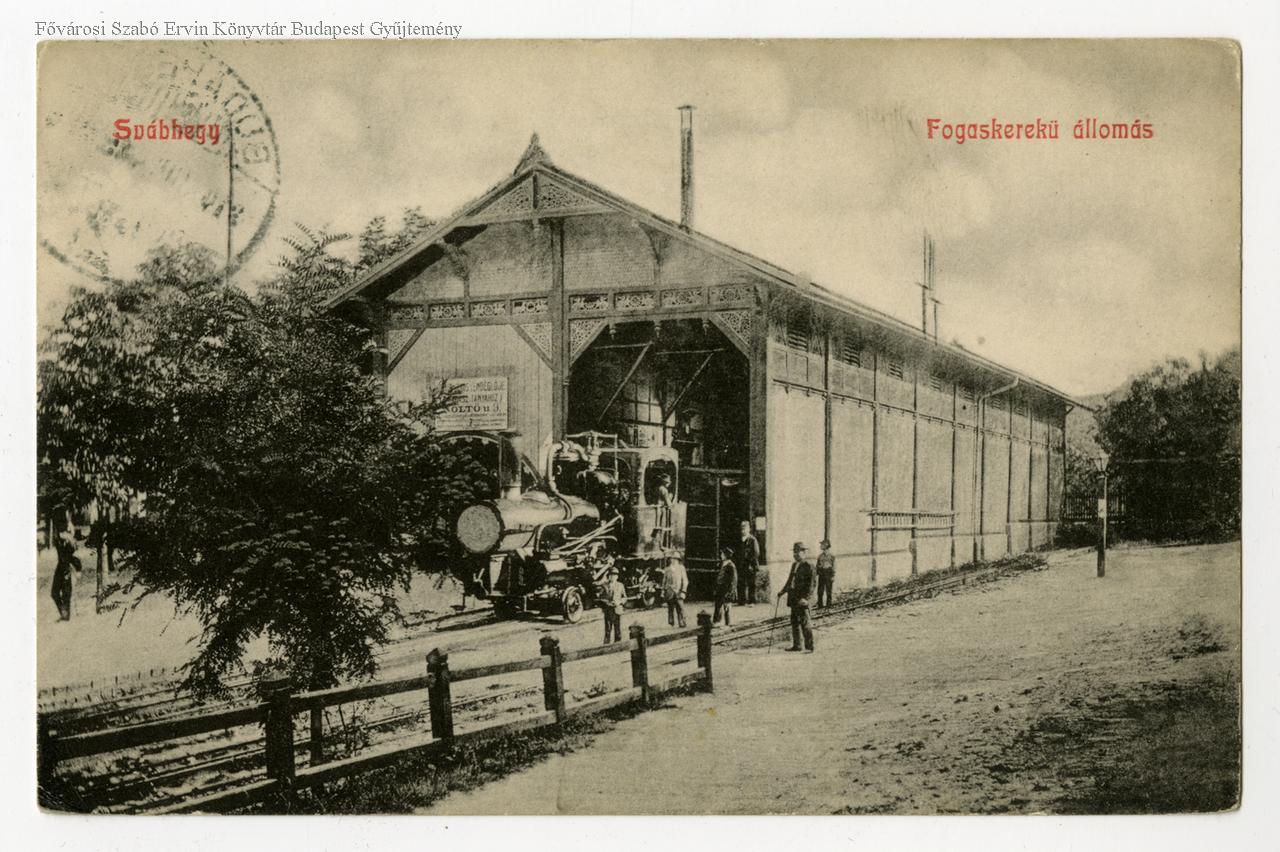 képes levelezőlap, fogaskerekű vasút, mozdony, vasúti sín, állomás, férfi, 1910 előtt