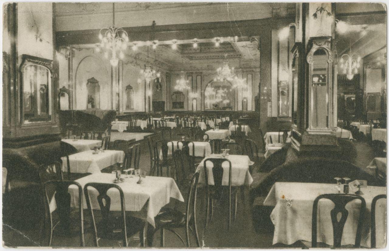 A hátoldalon lent: Világvárosi szórakozóhely. Esténként szalon-, jazz- és cigány-zenekarok. Ének. Híres konyha. Uzsonna-hangverseny.