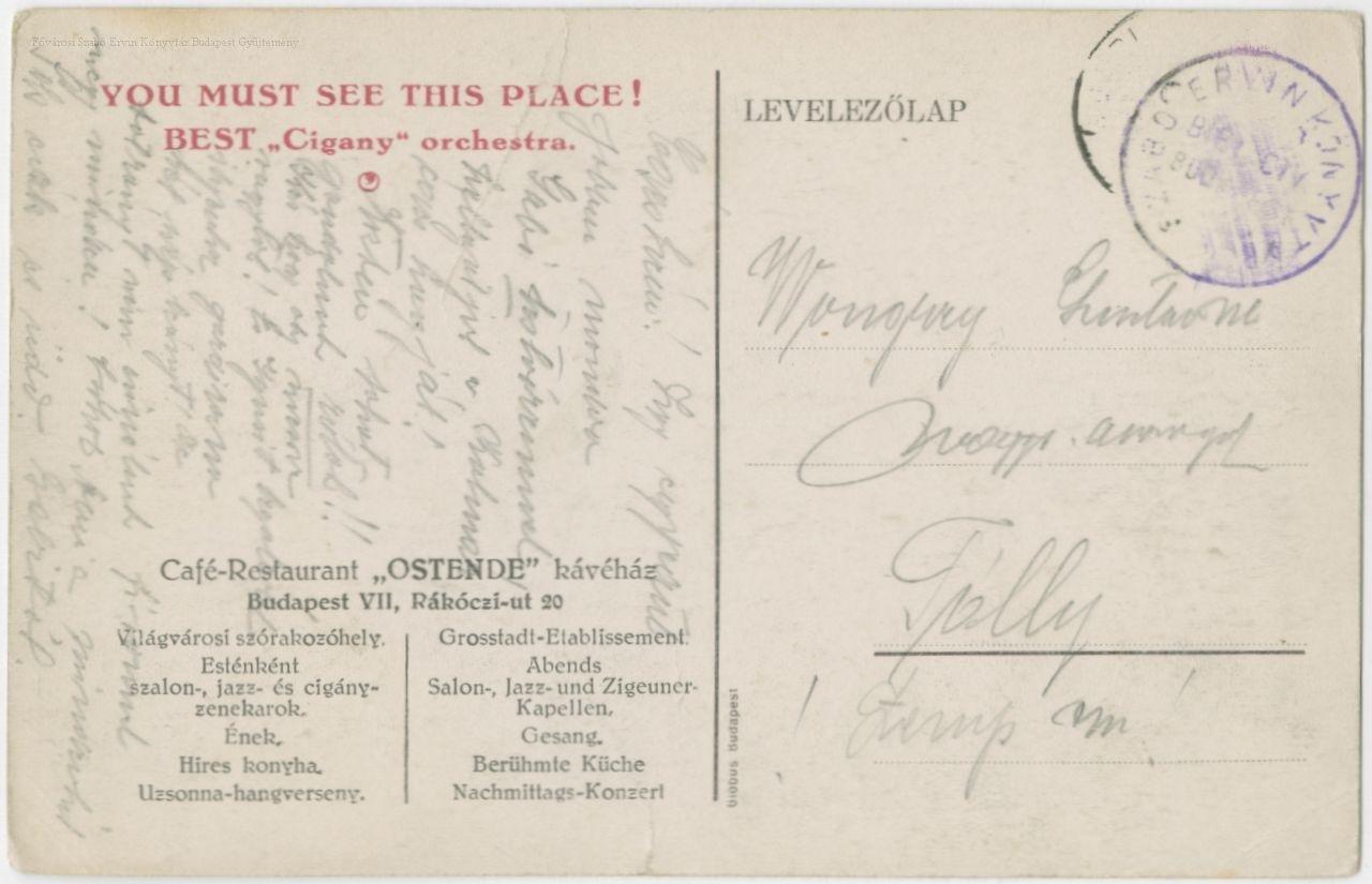 A hátoldalon felirat: You must see this place! Best "Cigany" orchestra