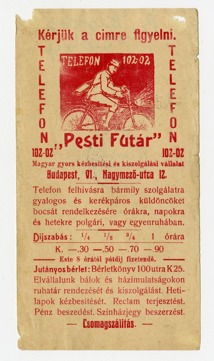 A hirdetés szövege: Pesti futár magyar gyors kézbesítési és kiszolgálási vállalat.