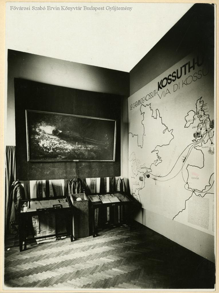A falon Kossuth Lajos külföldi útjait bemutató tabló, oldalt valószínűleg Kossuth-relikviák, festmény a ravatalról, gyásszalagok, halotti maszk (?)