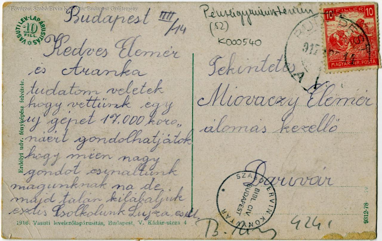 Vasúti levelezőlap árusítás, Budapest, Kádár utca 4.