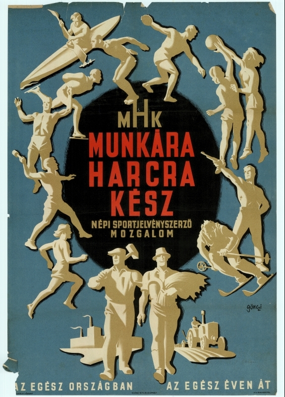 Az (MHK) munkára, harcra kész mozgalom plakátja. A mozgalom egy szovjet modell ihlette magyar sportkezdeményezés volt, amelyet 1949-ben, a Rákosi-korszakban indítottak el. Célja az erős, egészséges fiatalok munkára és honvédelemre való nevelése volt, olyan sportágakban rendezett versenyekkel, mint a futás, a dobás, az ugrás és a kerékpározás, ahol a résztvevők teljesítményükért kitűzőket szereztek. Az MHK az 1960-as évek közepéig működött, és jelentősen befolyásolta a tömegsportot és az iskolai testnevelést Magyarországon, hangsúlyozva a mérhető sportteljesítményeket.