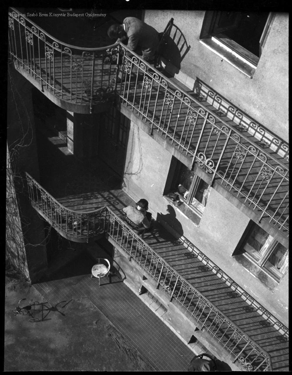 lakóház, bérház, folyosó, korlát, pihenés, varrás, jelenetkép, két világháború közötti időszak, 1930-as évek