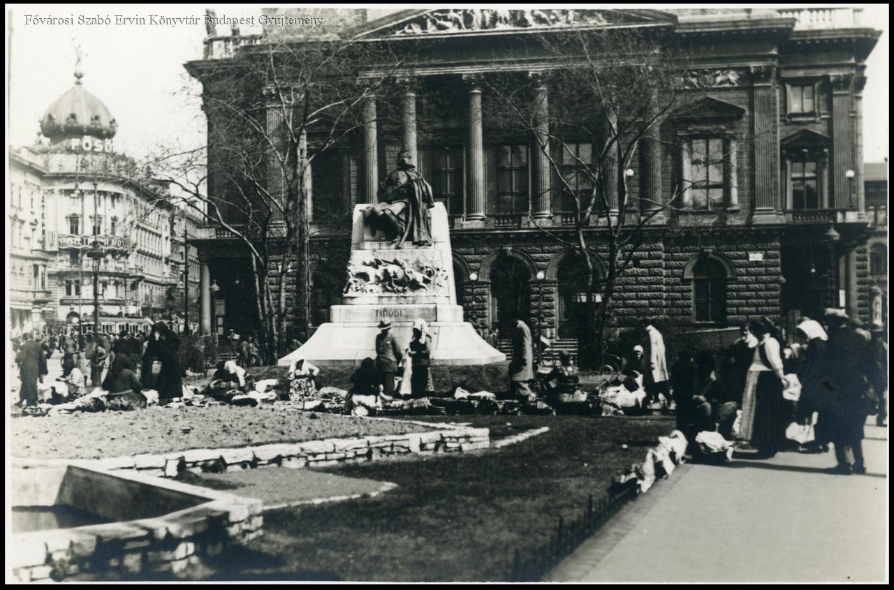[Tinódi Lantos Sebestyén szobra, előtte árusok, 1934. március 27.]