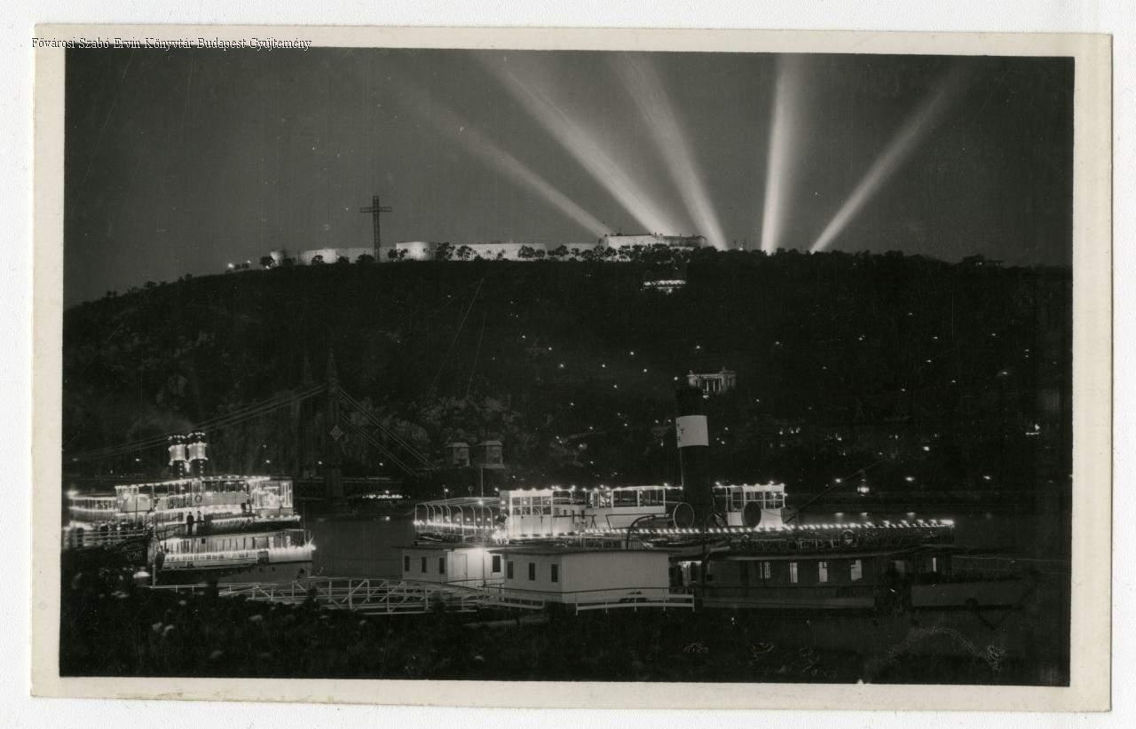 szobor, püspök, erőd, kereszt, éjjel, este, kivilágítás, hajó, hajóállomás, hitélet, vallási ünnep, római katolikus egyház, képes levelezőlap, külső felvétel, látkép, 1930-as évek