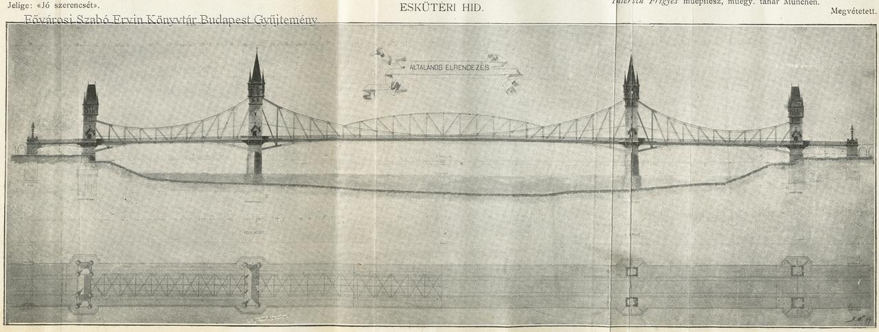 Eskütéri híd Jelige: "Jó szerencsét" : M. Kir. Államvasutak gépgyára Cathry Saléz és fia mérnökök, Schickedanz Albert építész Budapest
