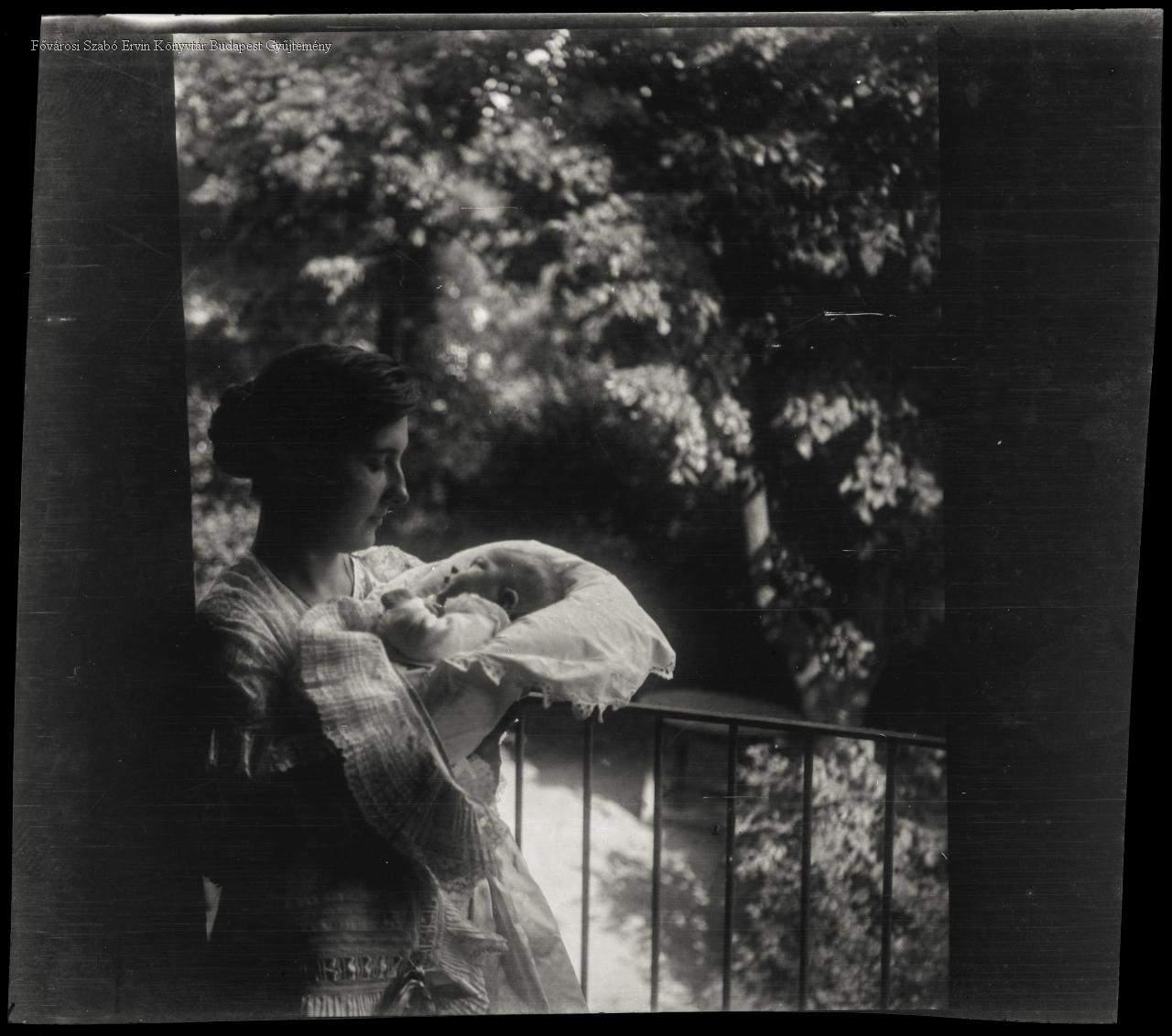 csecsemő, gyermek, anya, anyaság, nő, terasz, korlát, kert, növényzet