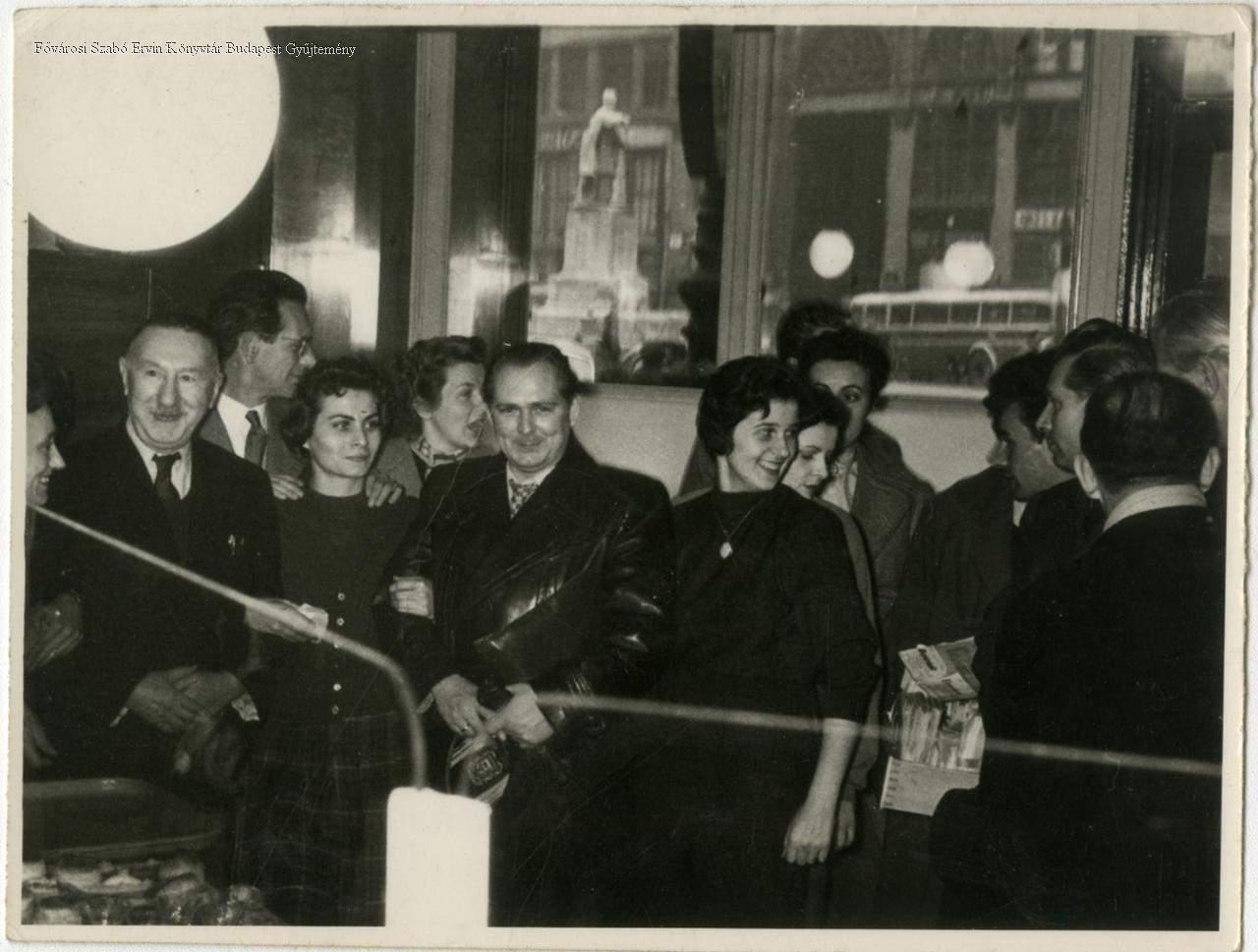 kávéház, nő, férfi, szobor, autóbusz, belső felvétel, csoportkép, 1950-es évek