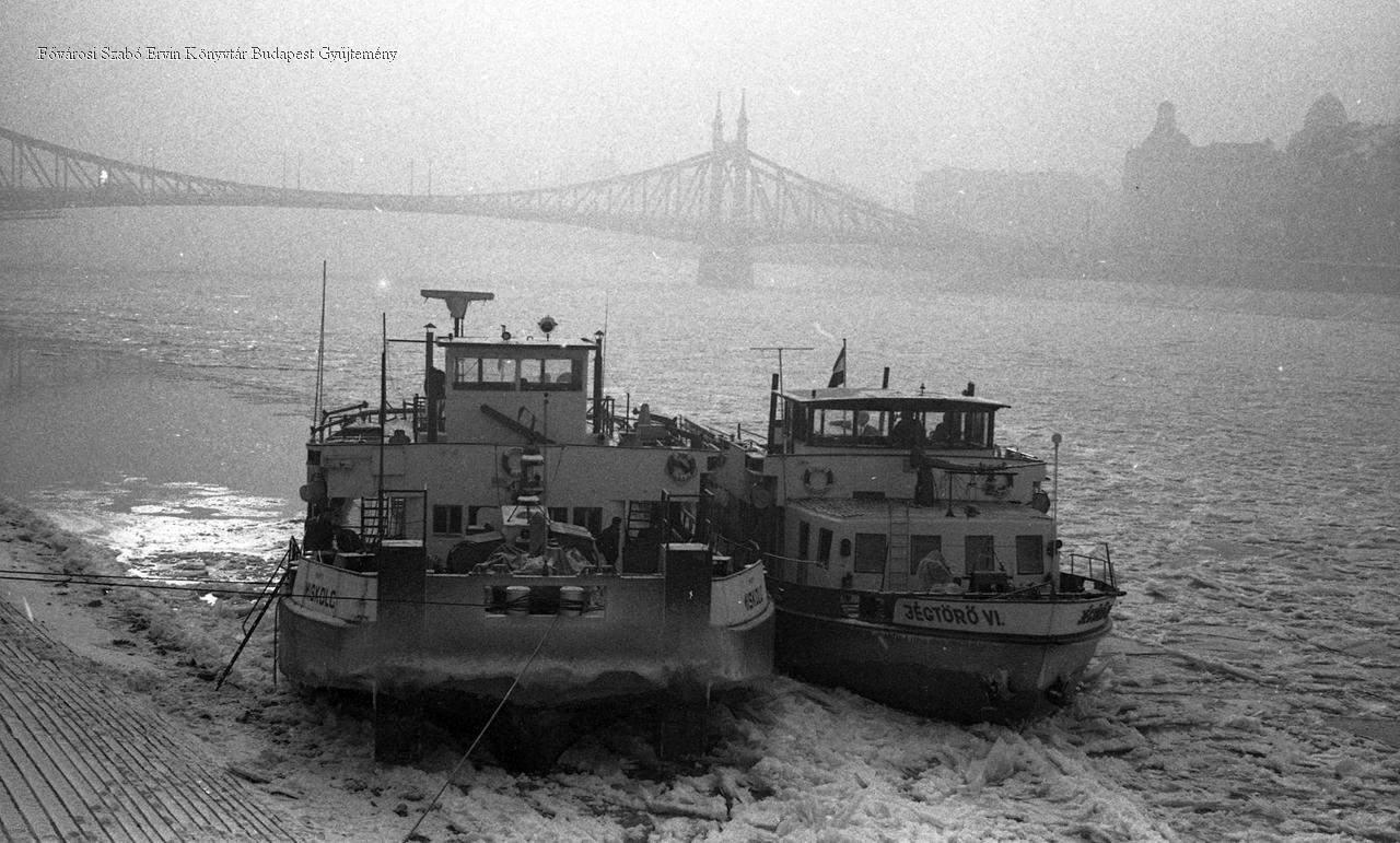 [Jégtörő hajók a jeges Dunán, a Pesti alsó rakpart mellett, mögöttük a Szabadság híd]