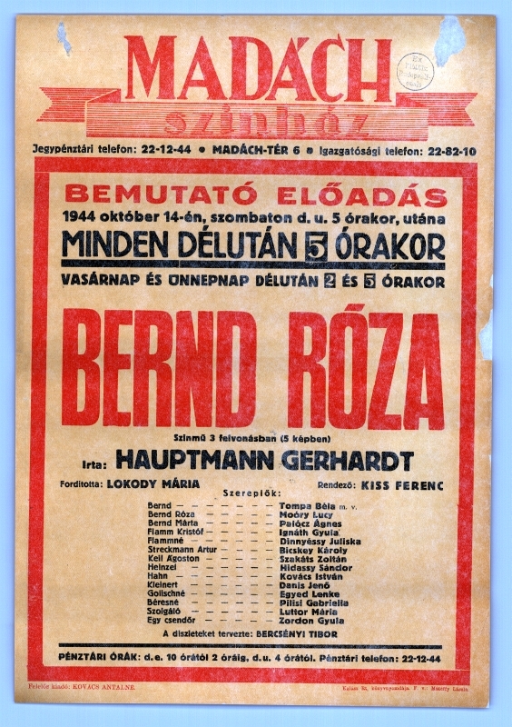 A Madách Színház, Hauptmann Gerhardt által írt és Kiss Ferenc által rendezett "Bernd Róza" című 3 felvonásos színművének plakátja. A mű fordítója: Lokody Mária, a díszlettervező Bercsényi Tibor volt. A darabban szereplő színészek: Tompa Béla, Moóry Lucy, Palócz Ágnes, Ignáth Gyula, Dinnyéssy Juliska, Bicskei Károly, Szakáts Zoltán, Hidassy Sándor, Kovács István, Danis Jenő, Egyed Lenke, Pilisi Gabriella, Luttor Mária, Zordon Gyula. A darab bemutatója 1944.október 14-én volt, és napi rendszerességgel játszották.