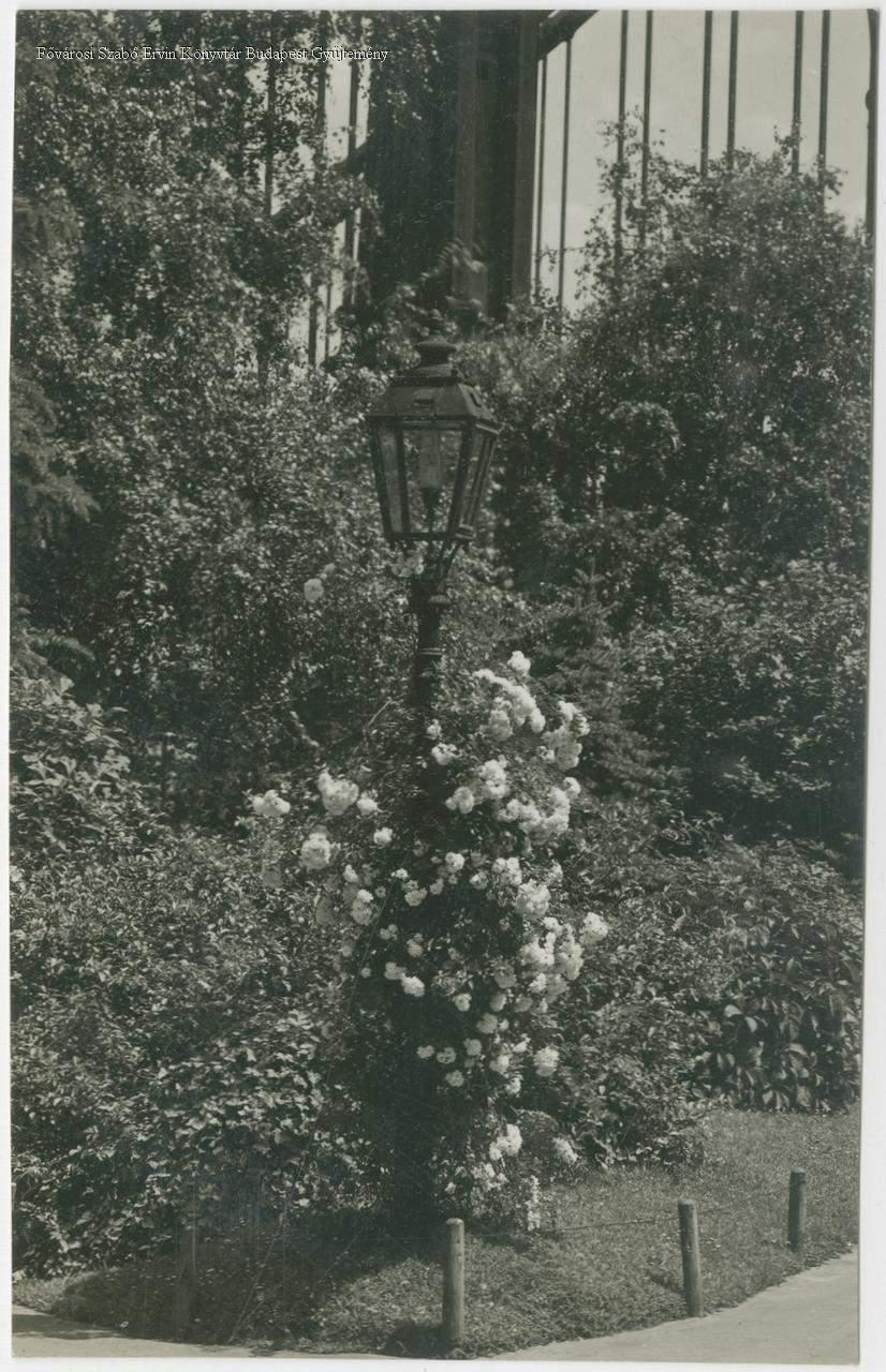 [Parkrészlet az Erzsébet híd budai hídfőjénél, lámpaoszlopra felfuttatott virágbokor]